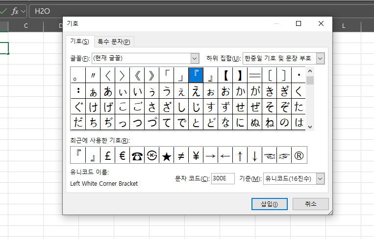 기호 메뉴를 클릭하면 아래와 같은 창이 나타납니다. 여기서 하위 집합 버튼을 사용하여 필요한 종류의 문자를 찾을 수 있습니다. (예: 히라가나, 한자, 그리스어 등) 선택 후 삽입 버튼을 누르면 해당 문자가 셀에 입력됩니다.