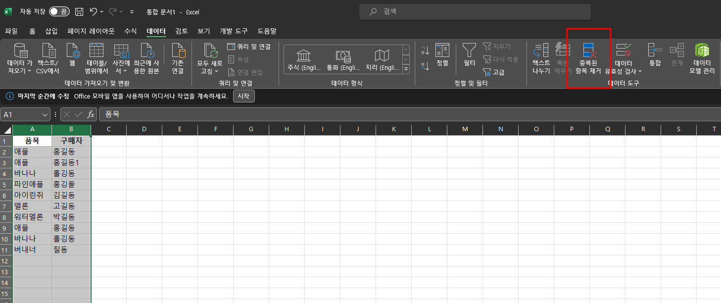 - "중복"이라고 표시된 행은 중복값이므로 해당 행을 제거하면 됩니다.