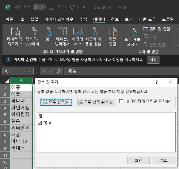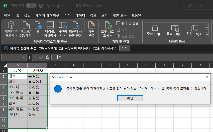 팝업창에서 선택한 열이 체크되어 있으며, 중복된 값을 확인한 후 [확인] 버튼을 클릭합니다.