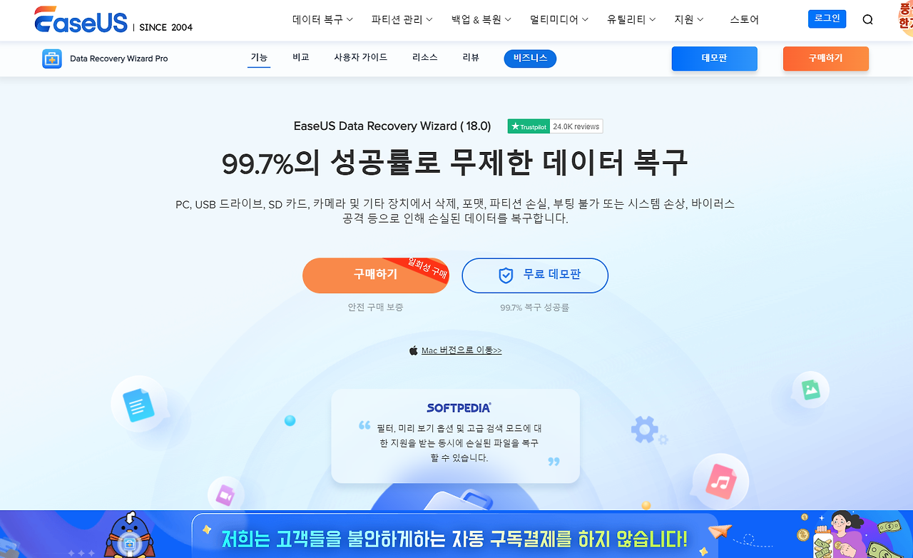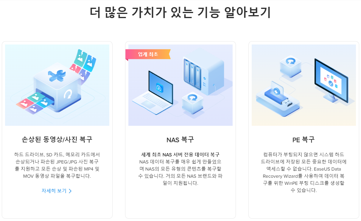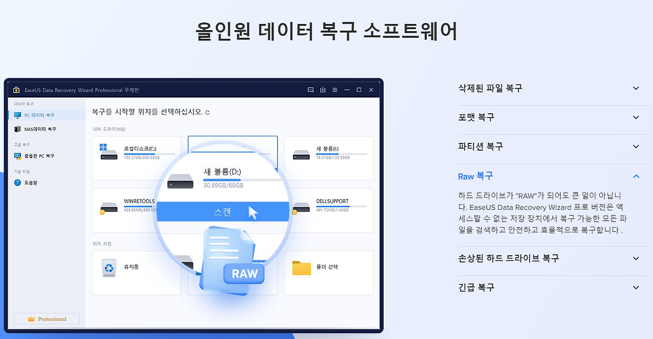 이지어스 데이터 복구는 단순한 복구 기능에 그치지 않고, 올인원 데이터 복구 소프트웨어로서 다양한 기능을 제공합니다. 이 프로그램은 삭제된 파일 복구는 물론, 포맷된 드라이브에서의 데이터 복구, 손상된 파티션에서의 복구 등 복구 가능한 범위가 매우 넓습니다. 또한, 사용자 친화적인 인터페이스를 갖추고 있어 복잡한 복구 과정도 간단하게 처리할 수 있습니다. 프로그램 내에서 제공되는 미리 보기 기능을 통해 복구할 파일을 사전에 확인할 수 있어, 더욱 정확한 데이터 복구가 가능합니다.