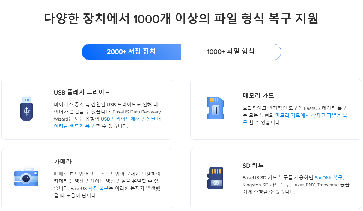 이지어스 데이터 복구 프로그램은 다양한 장치에서 데이터 복구를 지원합니다. 이 프로그램은 PC, 외장 하드 드라이브, USB 드라이브, SD 카드 등 거의 모든 저장 매체에서 데이터를 복구할 수 있는 기능을 제공합니다. 이를 통해 사용자는 여러 장치에서 실수로 삭제된 파일을 손쉽게 복원할 수 있습니다. 특히, 파일 시스템 손상이나 파티션 삭제 등의 상황에서도 복구가 가능하여, 다양한 데이터 손실 시나리오에 대응할 수 있습니다.