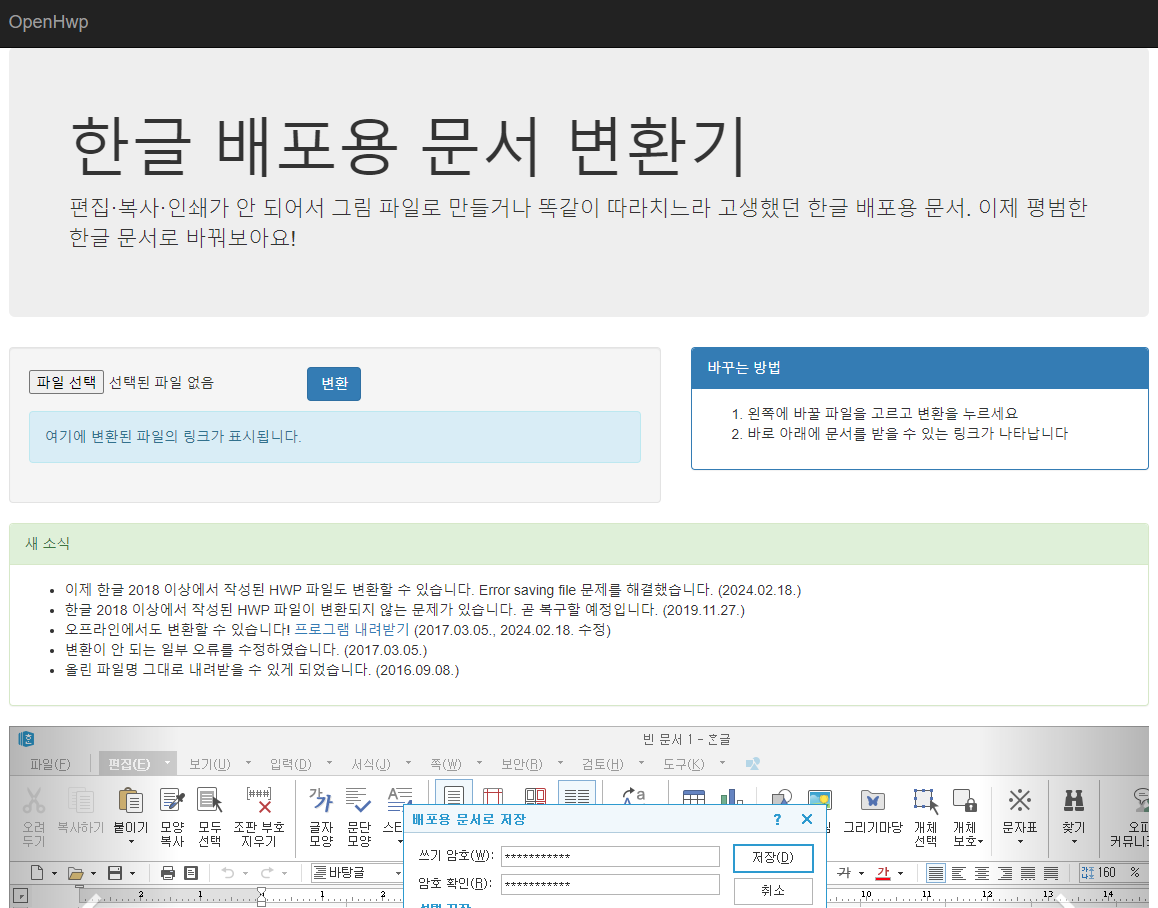 한글 배포용 문서 변환기 편집·복사·인쇄가 안 되어서 그림 파일로 만들거나 똑같이 따라치느라 고생했던 한글 배포용 문서. 이제 평범한 한글 문서로 바꿔보아요! 새 소식 이제 한글 2018 이상
