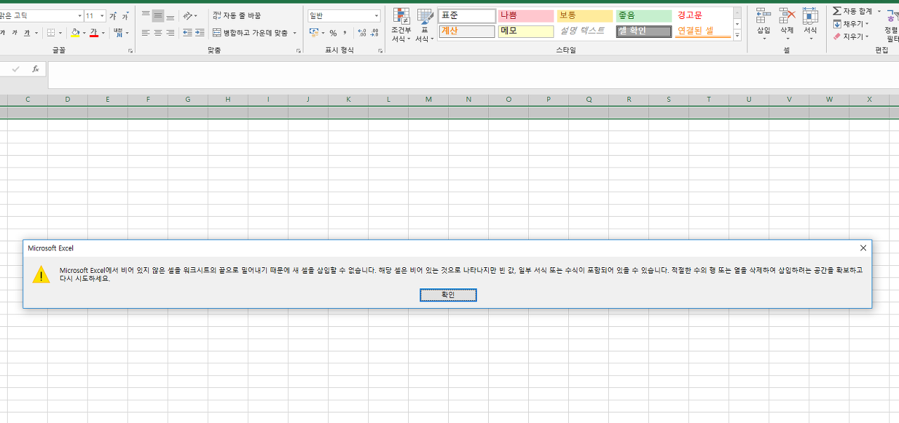 비어 있지 않은 셀을 워크시트의 끝으로 밀어내기 때문에 새 셀을 삽입할 수 없습니다. 해당 셀은 비어 있는 것으로 나타나지만 빈 값, 일부 서식 또는 수식이 포함되어 있을 수 있습니다. 적절한 수의 행 또는 열을 삭제하여 삽입하려는 공간을 확보하고 다시 시도하세요.