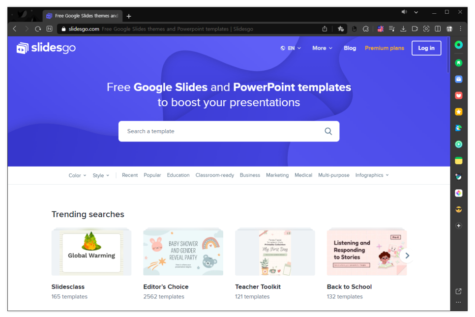 슬라이드고(Slidesgo)는 무료 PPT 템플릿을 제공하는 사이트로, 파워포인트를 활용해 프로페셔널한 발표 자료를 쉽게 만들 수 있도록 도와줍니다. 이용하기 매우 간단하며, 네이버에서 ‘slidesgo’를 검색하여 사이트에 접속할 수 있습니다.