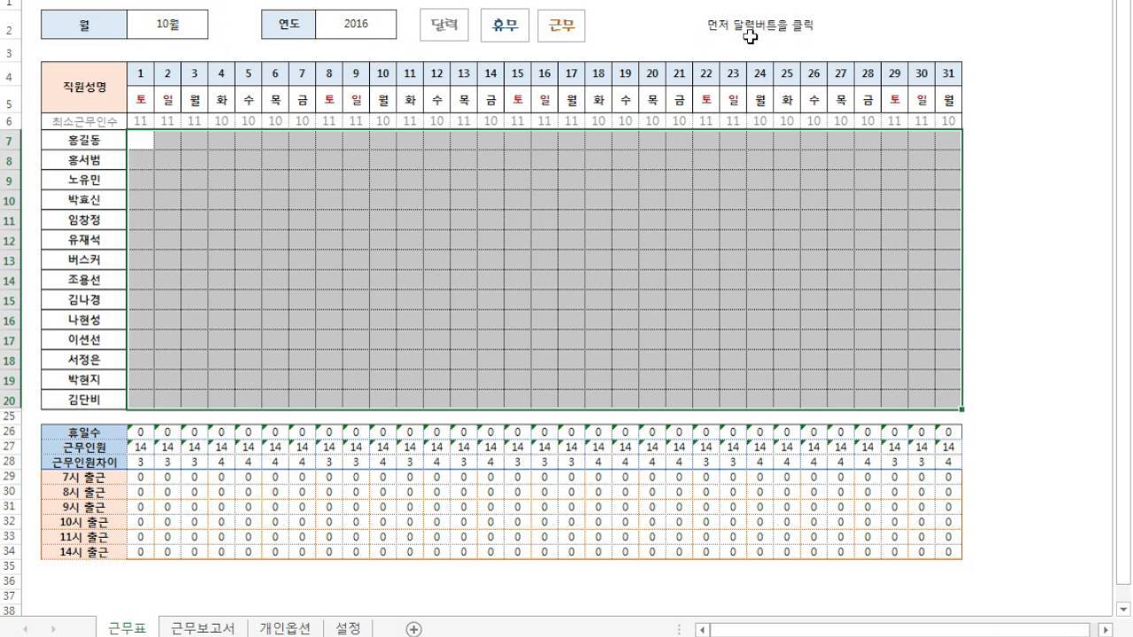 - 기본 레이아웃 설정하기: 근무표의 기본 레이아웃을 설정해야 해. 날짜, 요일, 직원 이름 등 필요한 열을 만들어.