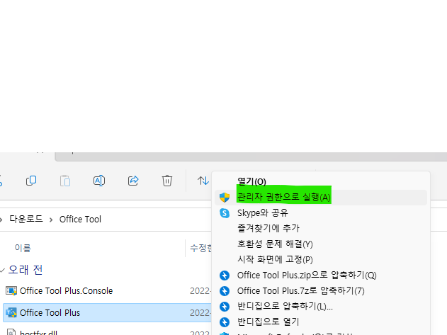 압축 해제한 파일 중 “Office Tool Plus”를 관리자 권한으로 실행하세요.