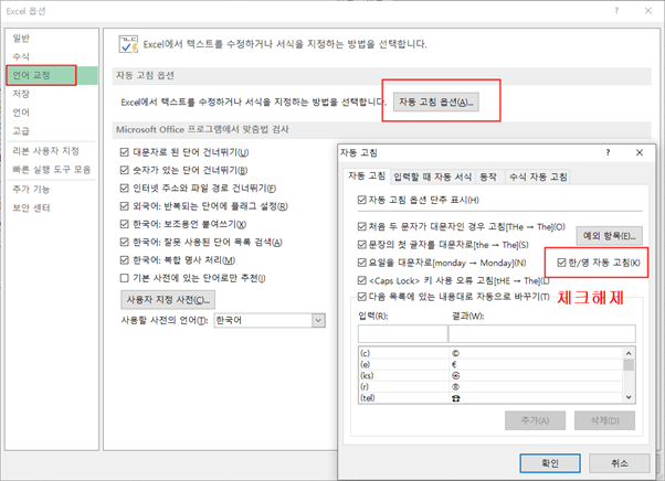 엑셀, 자동 변환 해제, 엑셀 옵션, 언어교정, 자동 고침, 한영 자동 고침, 엑셀 설정, 엑셀 한글 변환, 엑셀 영문 입력, 엑셀 팁