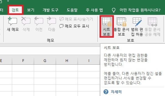 1. “검토” 탭을 선택한 후 “시트 보호”를 클릭합니다.
