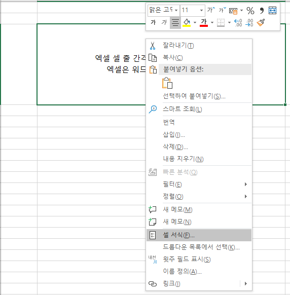 셀에서 마우스 오른쪽 버튼을 눌러서 셀서식을 선택하세요.