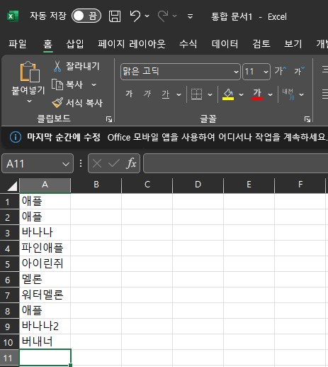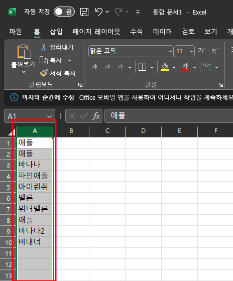 엑셀 중복값 제거하기