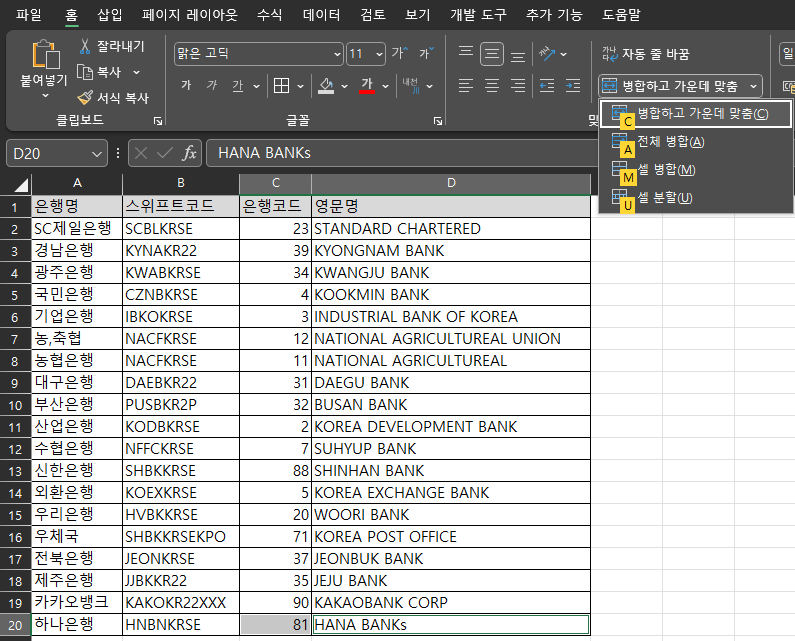 를 누르면 선택한 셀이 합쳐집니다. - 메뉴를 통한 설정: