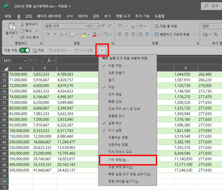 • 엑셀 상단의 리본 메뉴에서 빠른 실행 도구 모음의 오른쪽 끝에 있는 드롭다운 아이콘을 클릭합니다.