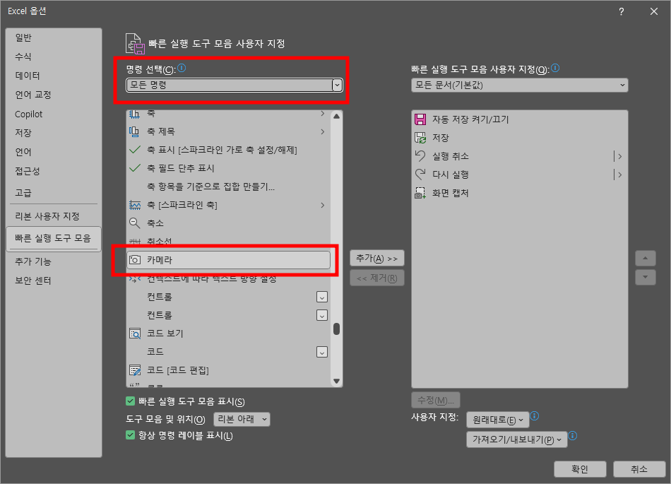 만약 리본 메뉴에 카메라 도구가 보이지 않는다면, 아래의 간단한 절차를 따라 빠른 실행 도구 모음에 추가할 수 있습니다.