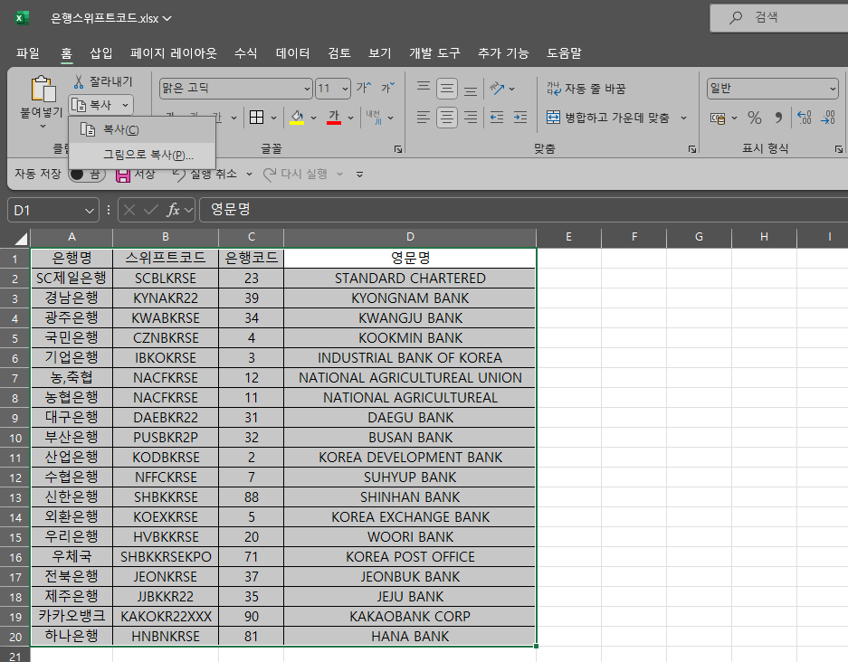 엑셀 파일을 열고, 캡쳐하고자 하는 표나 범위를 마우스로 드래그하여 선택합니다. 이때 표의 셀뿐만 아니라 표의 레이아웃과 서식도 포함되도록 선택하는 것이 좋습니다. - ‘그림으로 복사’ 기능 선택하기