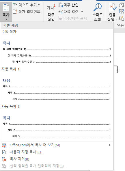 - 사용자 지정 목차: 사용자의 필요에 맞게 목차의 형식을 사용자 지정할 수 있습니다. 이 옵션을 사용하면 목차의 스타일, 레벨, 포맷을 조정할 수 있습니다.