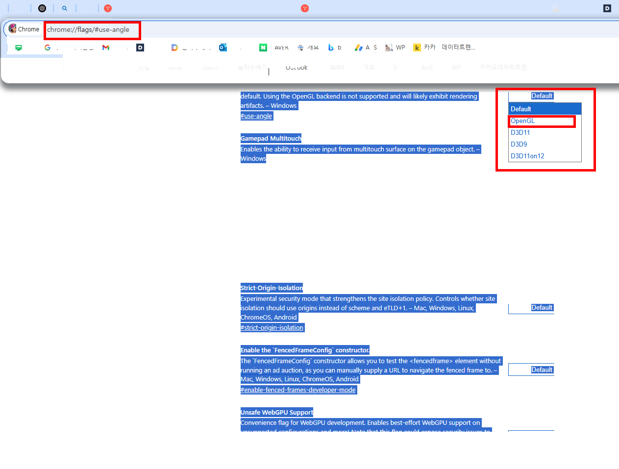 검색 - “Choose ANGLE graphics backend” 항목을 찾아서 기본값에서 OPENGL로 변경