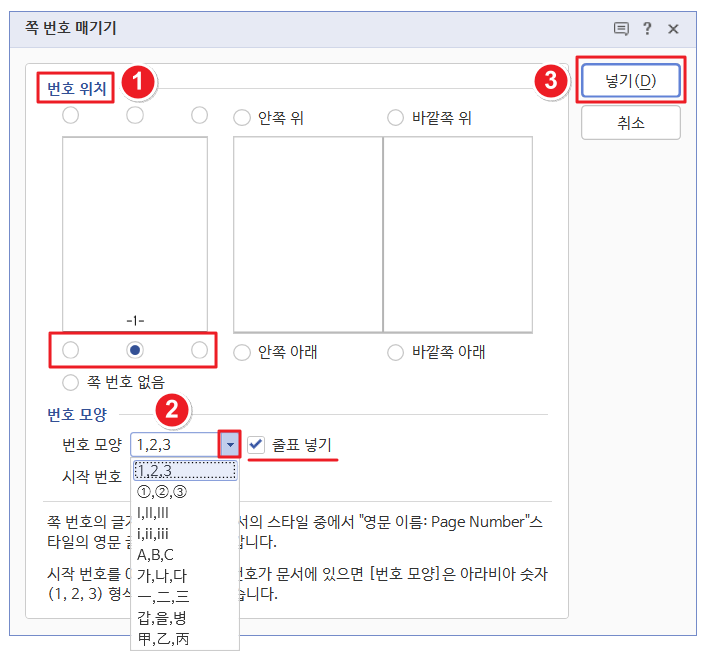 - 줄표 넣기: 줄표 넣기 체크 박스를 선택하면 쪽 번호 앞에 줄표가 추가되어 -1- 형식으로 삽입됩니다.