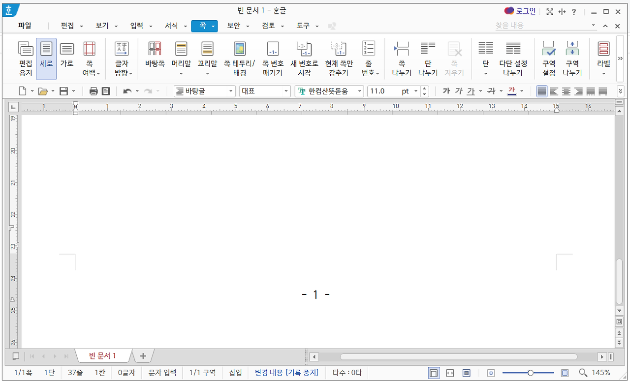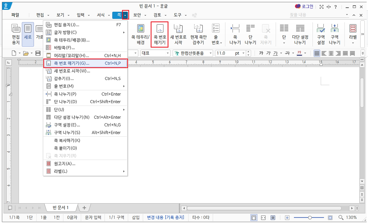 - 쪽 탭 선택: 한글 상단 메뉴에서 [쪽] 탭을 클릭합니다.