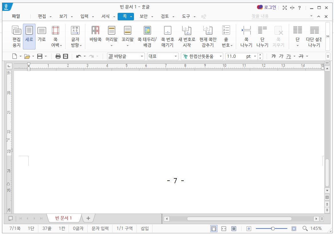 - 쪽 탭 선택: 상단 메뉴에서 [쪽] 탭을 클릭합니다.