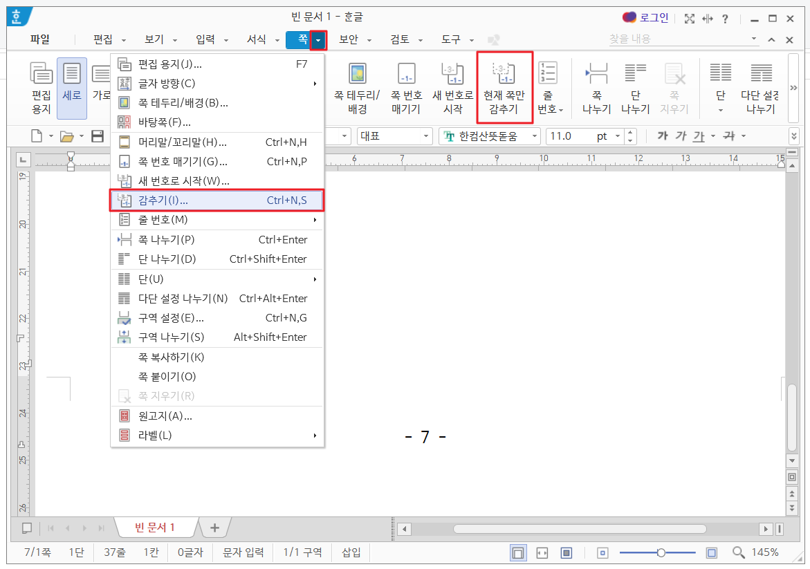 - 해당 페이지로 이동: 쪽 번호를 감추고자 하는 페이지로 이동합니다.