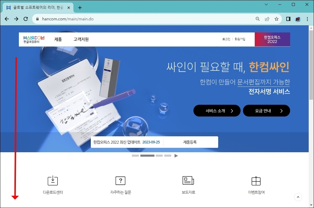 - 한글과 컴퓨터 홈페이지가 열리면, 화면을 아래로 스크롤 합니다.