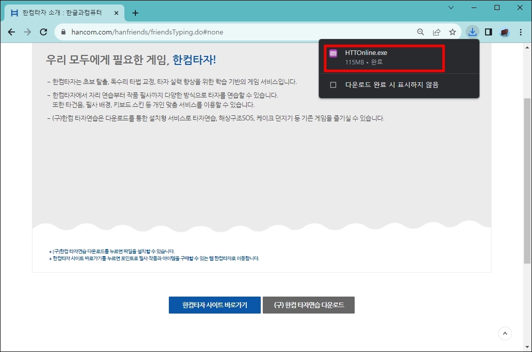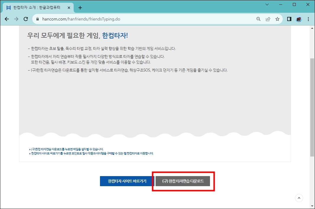 - 한컴 타자연습 관련 페이지에 들어간 후, 구버전 다운로드 옵션을 찾아 선택합니다.