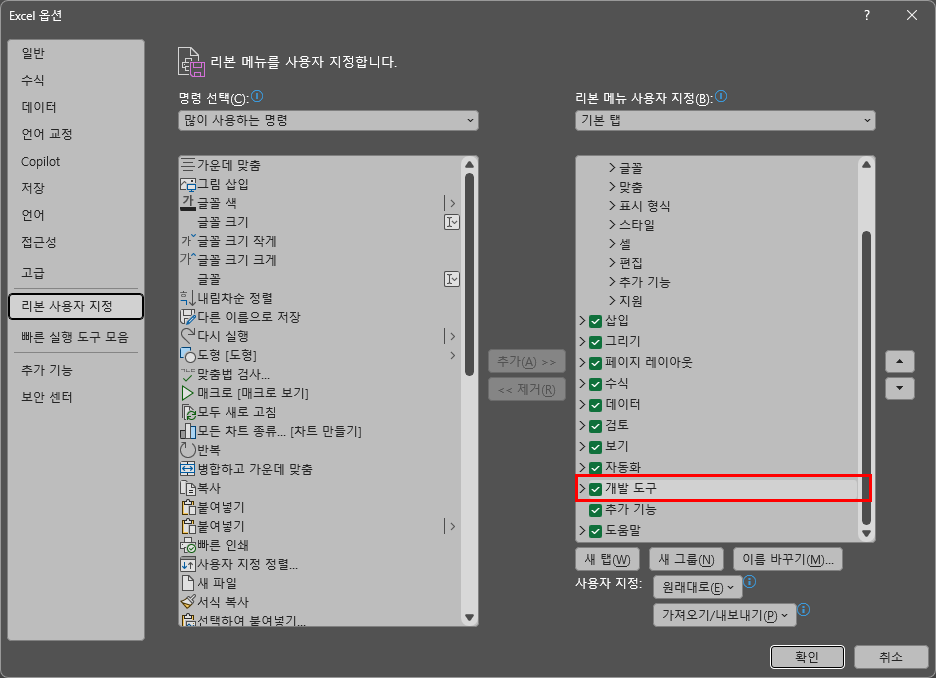 개발 도구 탭 활성화 방법